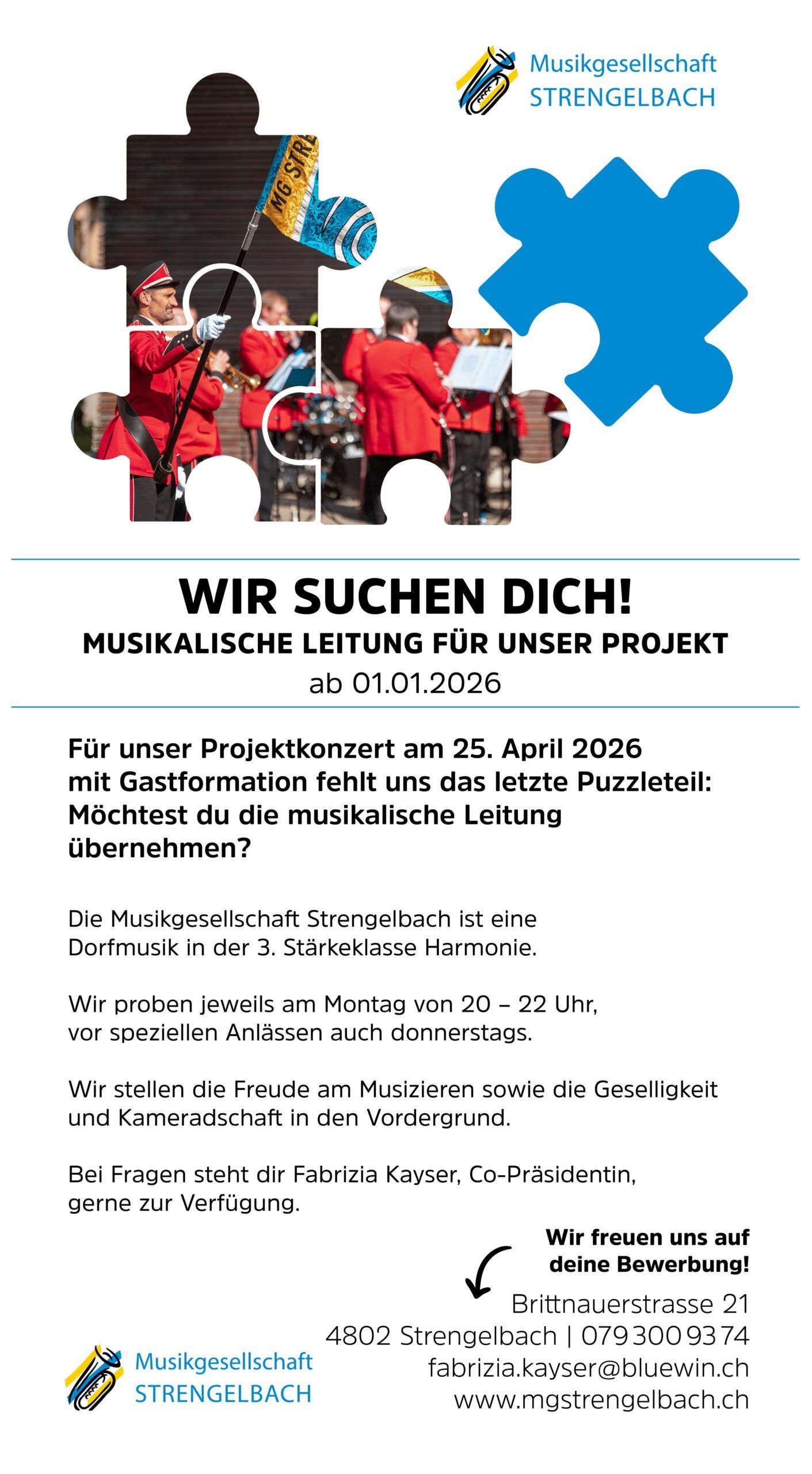 Für unser Projektkonzert am 25. April 2026 mit Gastformation fehlt uns das letzte Puzzleteil: